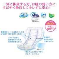 パッド内部に瞬間吸収シートを採用、尿をすばやく吸収するので、一気に排尿しても横向き寝でもモレずに安心です。